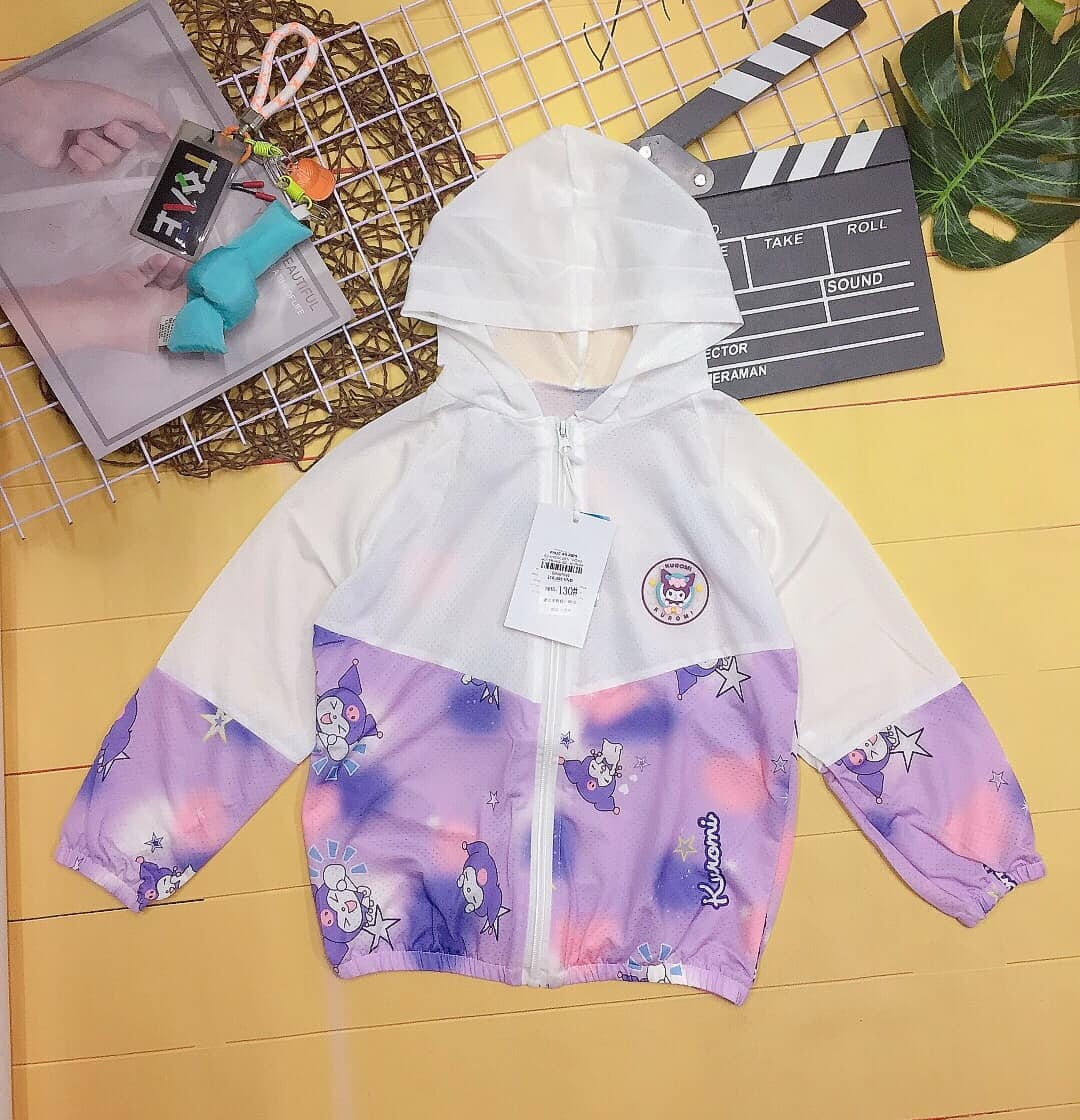 Áo khoác mang phong cách dễ thương với họa tiết Kuromi, một nhân vật nổi tiếng từ Sanrio. Áo có tông màu chủ đạo là tím nhạt, tím đậm phối hợp hài hòa với màu trắng, tạo nên vẻ ngọt ngào và nổi bật.