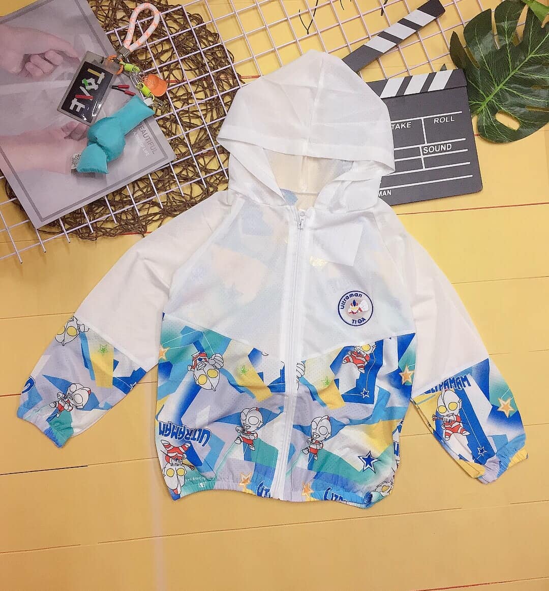 Áo khoác được thiết kế với họa tiết Ultraman, nhân vật siêu anh hùng nổi tiếng. Áo có tông màu xanh da trời kết hợp với màu trắng, tạo cảm giác năng động và mạnh mẽ.