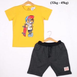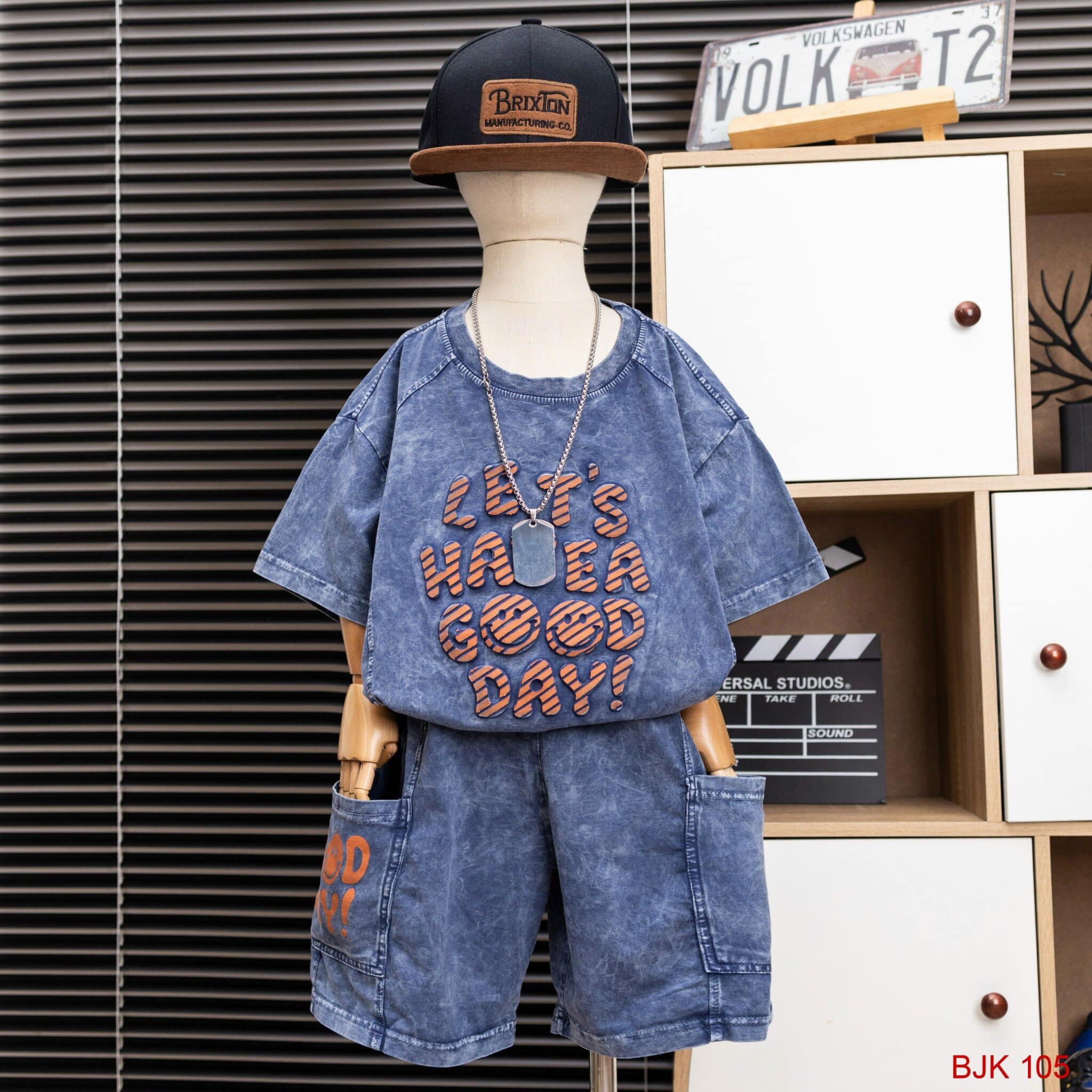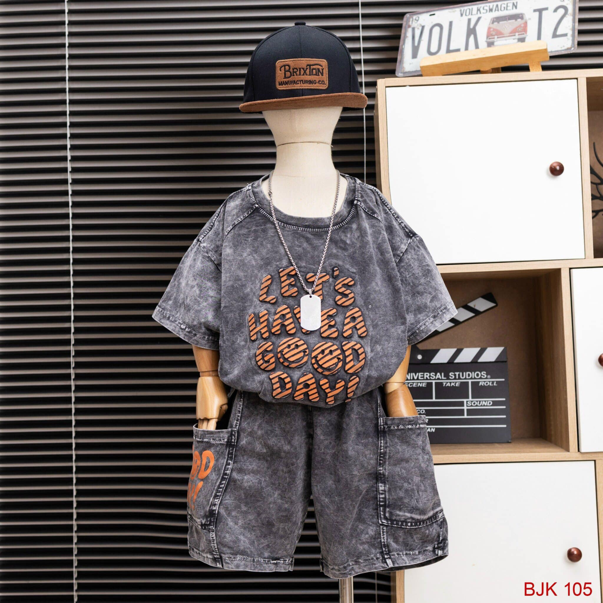 Bộ quần áo này dành cho bé trai, bao gồm áo thun và quần short xám đen với hiệu ứng mài bạc, tạo cảm giác cổ điển và phong cách. Áo thun tay ngắn in chữ “LET’S HAVE A GOOD DAY!” màu cam nổi bật, kết hợp cùng quần short có túi lớn hai bên và chữ “GOOD DAY” màu cam đồng điệu với áo. Đi kèm là mũ lưỡi trai đen với logo “BRIXTON” màu nâu và dây chuyền bạc mặt chữ nhật, tạo điểm nhấn cho bộ trang phục, mang đến vẻ ngoài năng động và thời trang cho bé khi đi chơi hoặc hoạt động ngoài trời.
